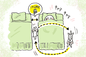 風邪をひいたので、だんなのベッドを少し離していたところ猫一匹が通れるぐらいの隙間ができた。